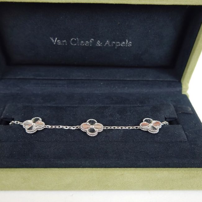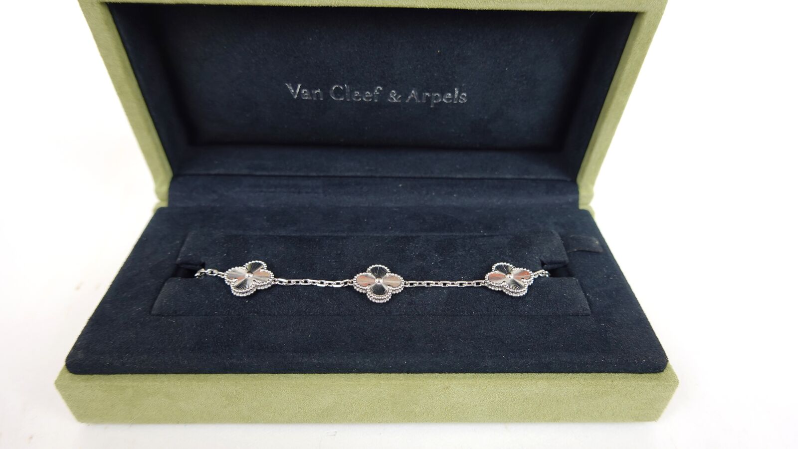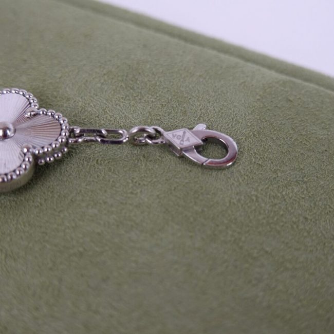 Bracelet Van Cleef & Arpels Vintage Alhambra à 5 motifs en or blanc 18 carats, finition guillochée et bord perlé. Pièce iconique de la Maison, signe distinctif de féminité et de chance. Disponible chez MCA Luxury Bags à Monaco.