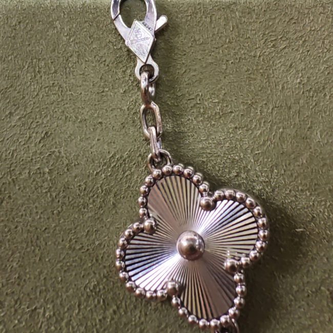 Le bracelet Vintage Alhambra est l’une des créations les plus reconnues et les plus désirables de Van Cleef & Arpels. Son motif quadrilobé, symbole de chance, traverse les époques sans prendre une ride. La version en or blanc guilloché est particulièrement recherchée pour son éclat subtil et son raffinement. Un classique absolu de la haute joaillerie, à porter au quotidien comme dans les plus grandes occasions.