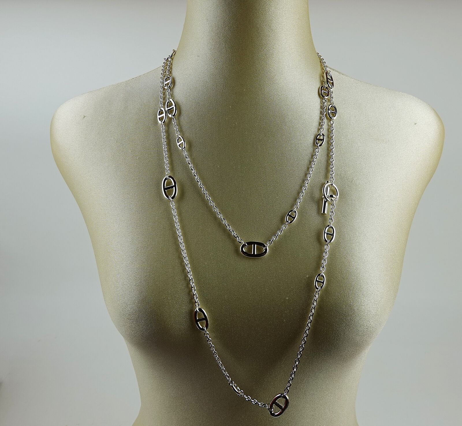 Le collier Hermès Farandole 160 cm est la version la plus généreuse de cet emblème de la joaillerie Hermès. Sa longueur exceptionnelle permet une multitude de combinaisons : sautoir descendu très bas, double ou triple rang, ou même drapé en bandoulière. Une pièce à la fois statement et discrète selon la manière de la porter.