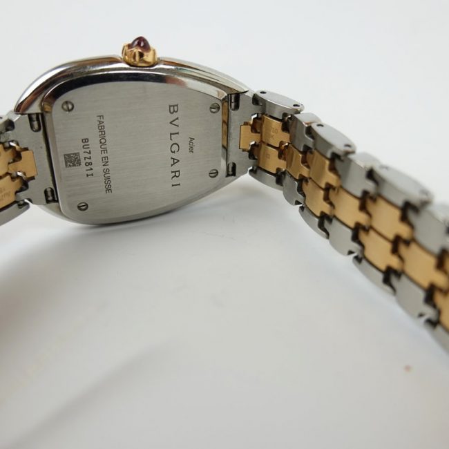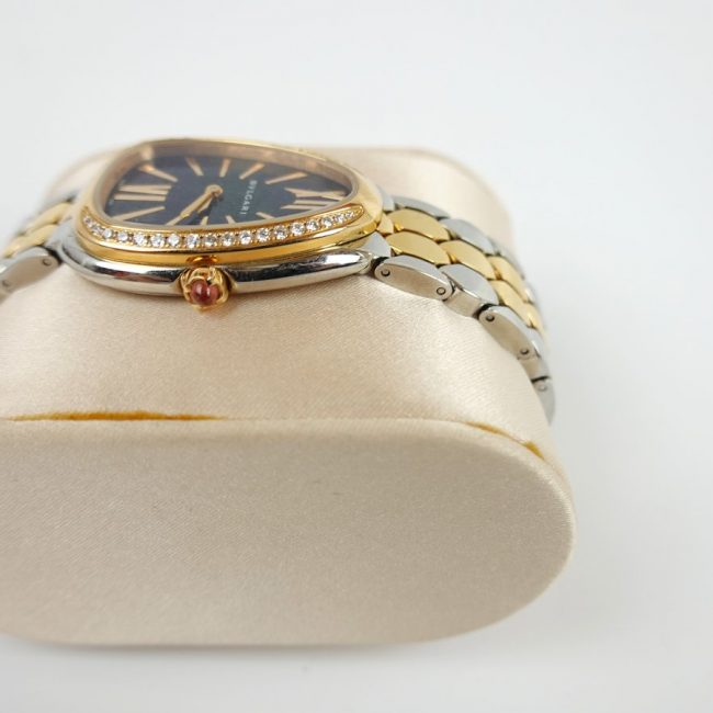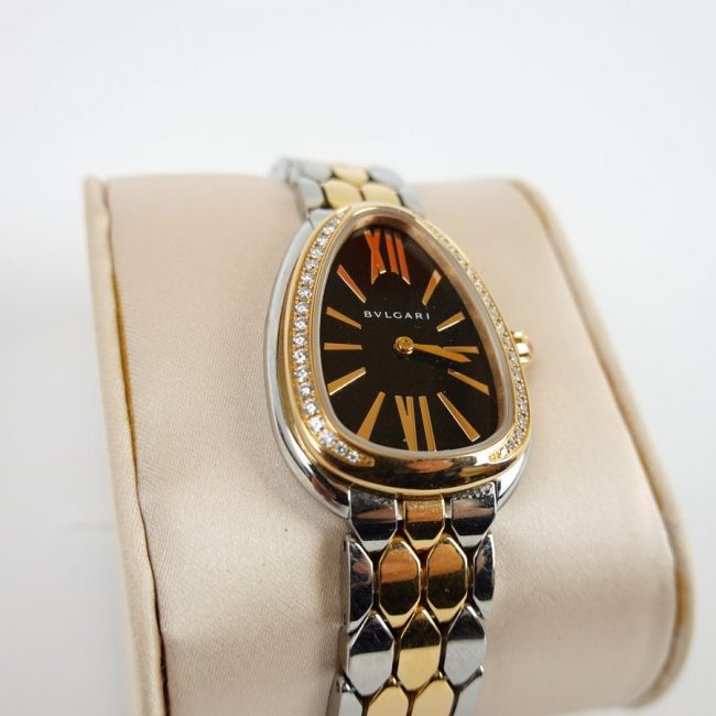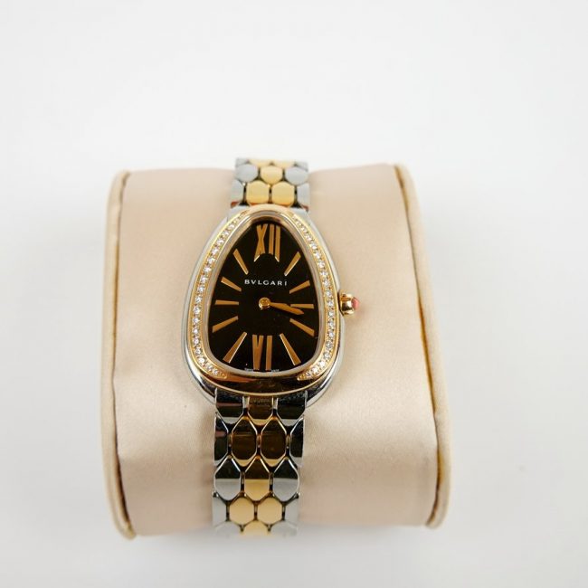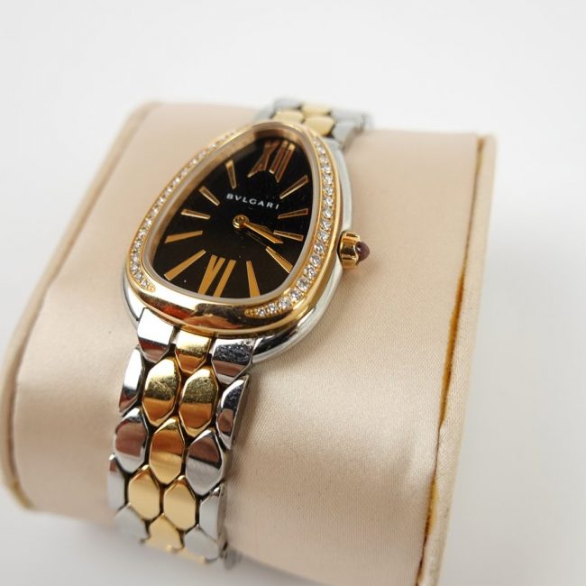 Ligne Serpenti iconique ; sertissage de 38 diamants ; combo or rose/acier polyvalent ; mouvement quartz précis et pratique au quotidien.