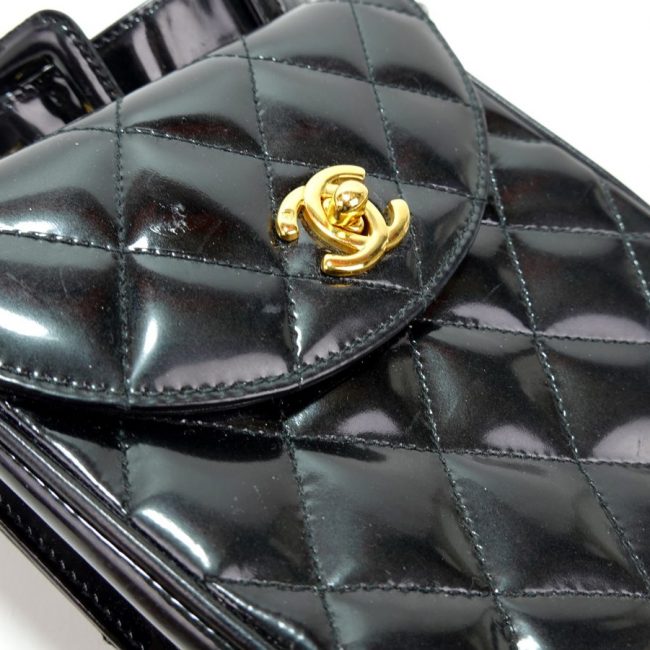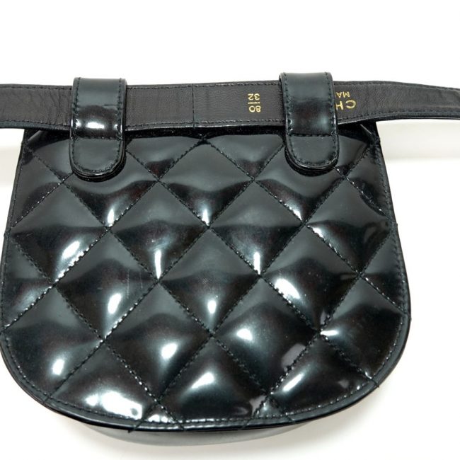Pochette Chanel en cuir verni noir, pensée pour se porter à la ceinture (taille 80 cm). Format compact pour transporter l’essentiel tout en gardant les mains libres.