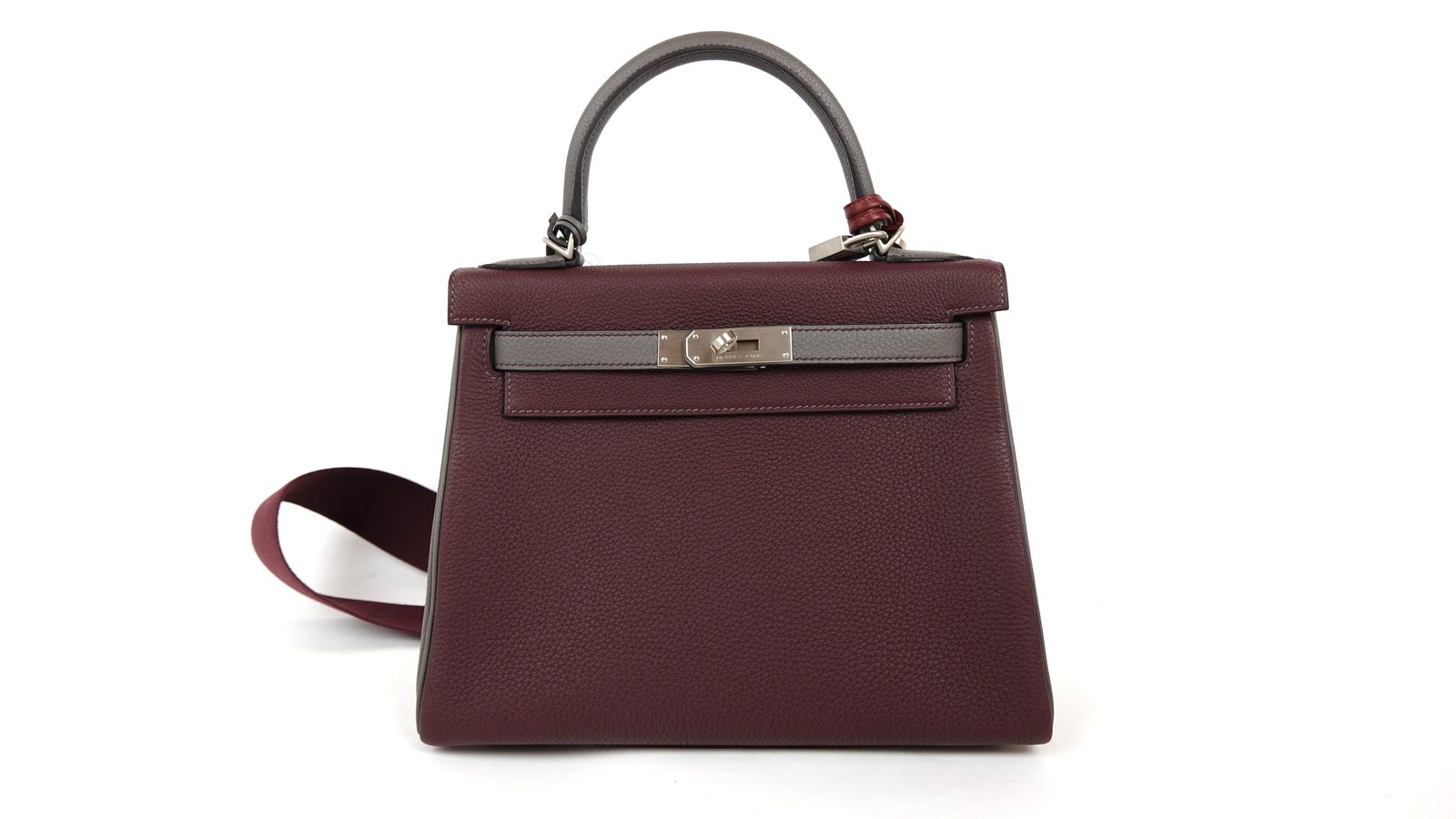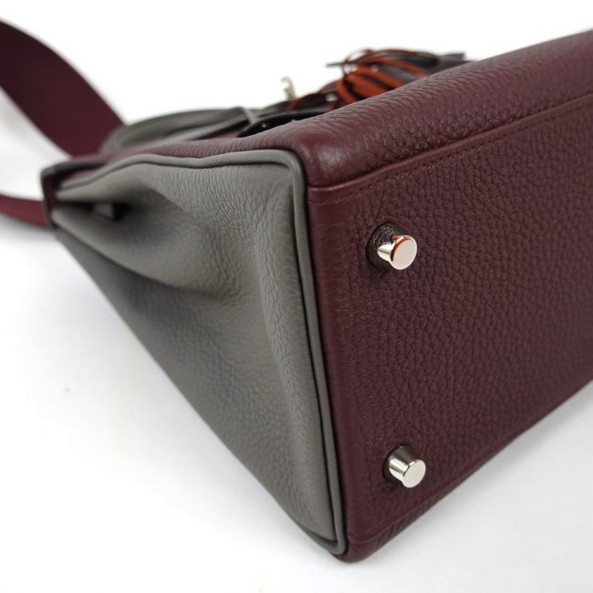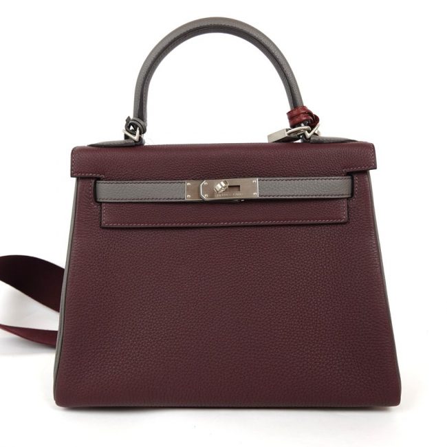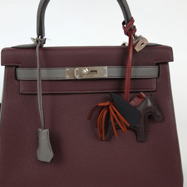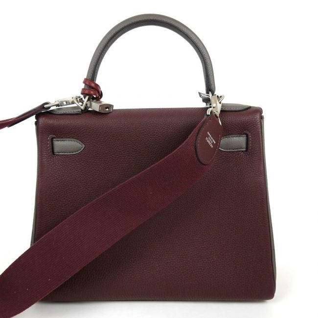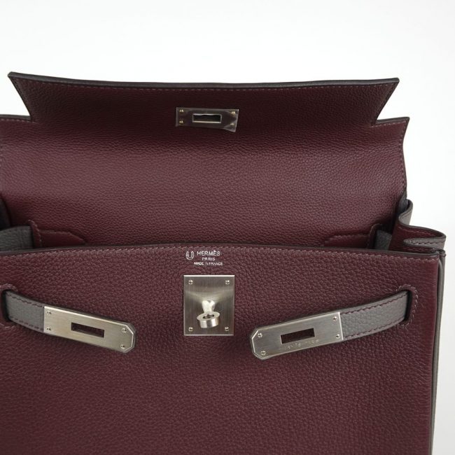 Sac à Main Hermès Kelly 28 en cuir bordeaux et gris stamp D 2019.