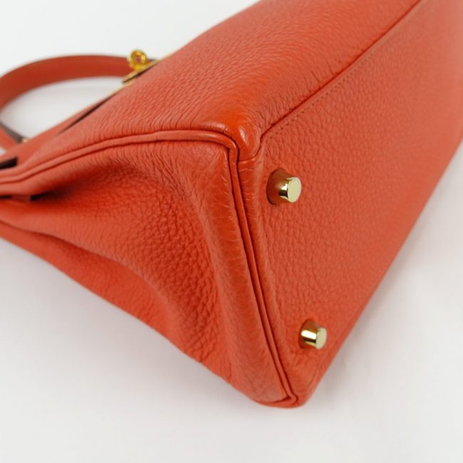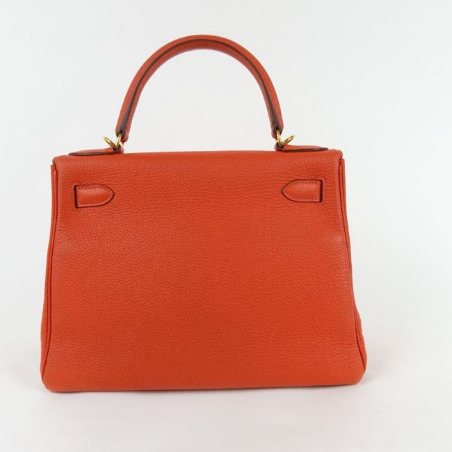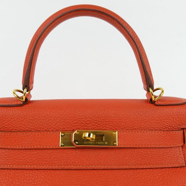 Sac Hermès Kelly 28 en cuir Togo de couleur orange. Le cuir Togo est un cuir de veau grainé, apprécié pour sa tenue et sa durabilité.